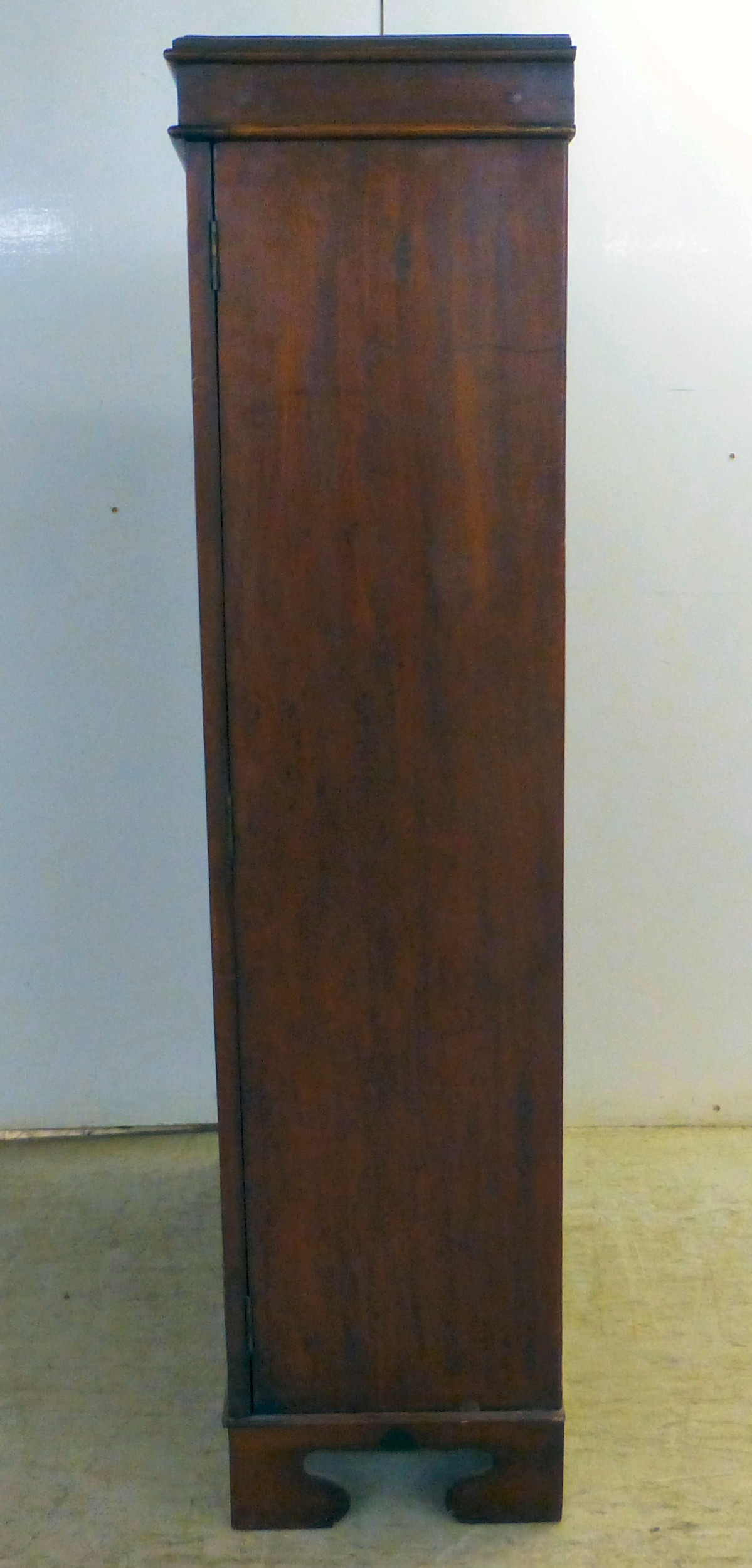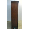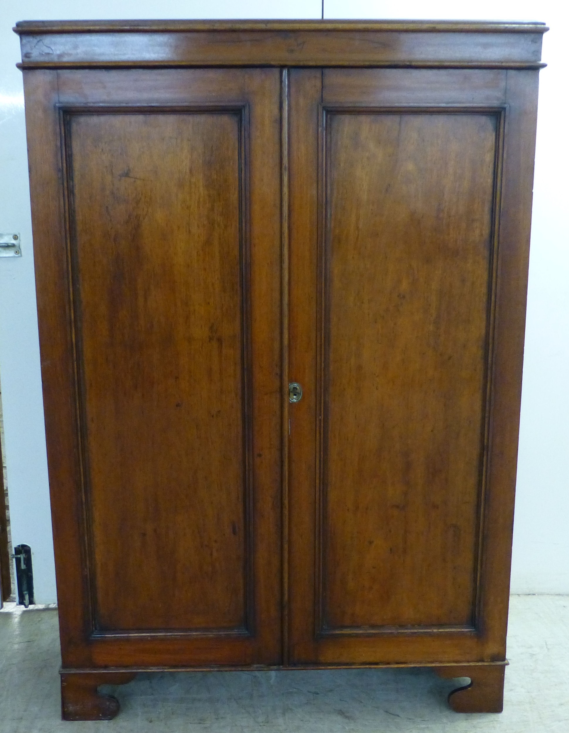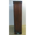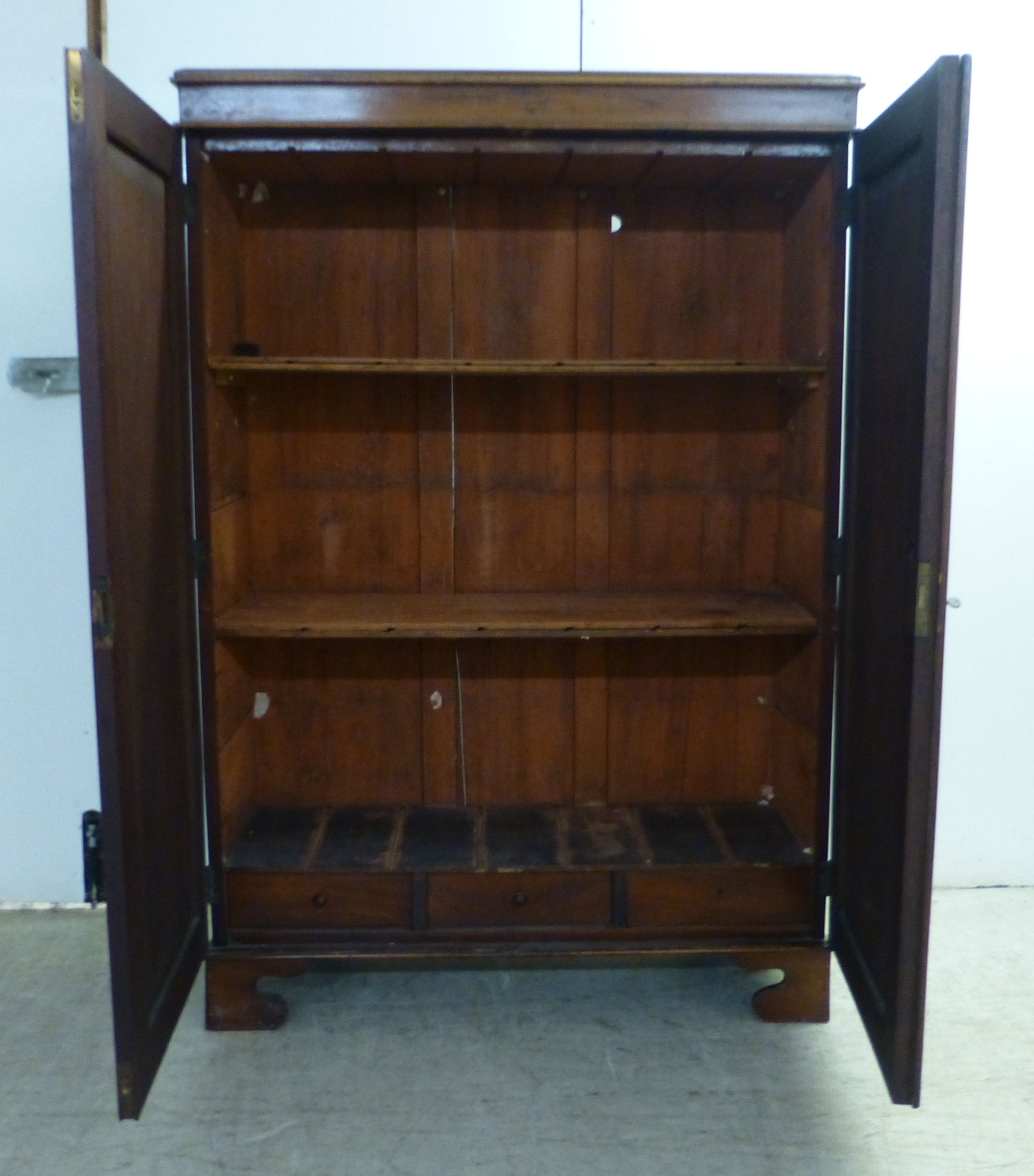 An early 20thC mahogany two door cabinet, enclosing two shelves, over three in-line drawers, raised on bracket feet 49"h 35"w