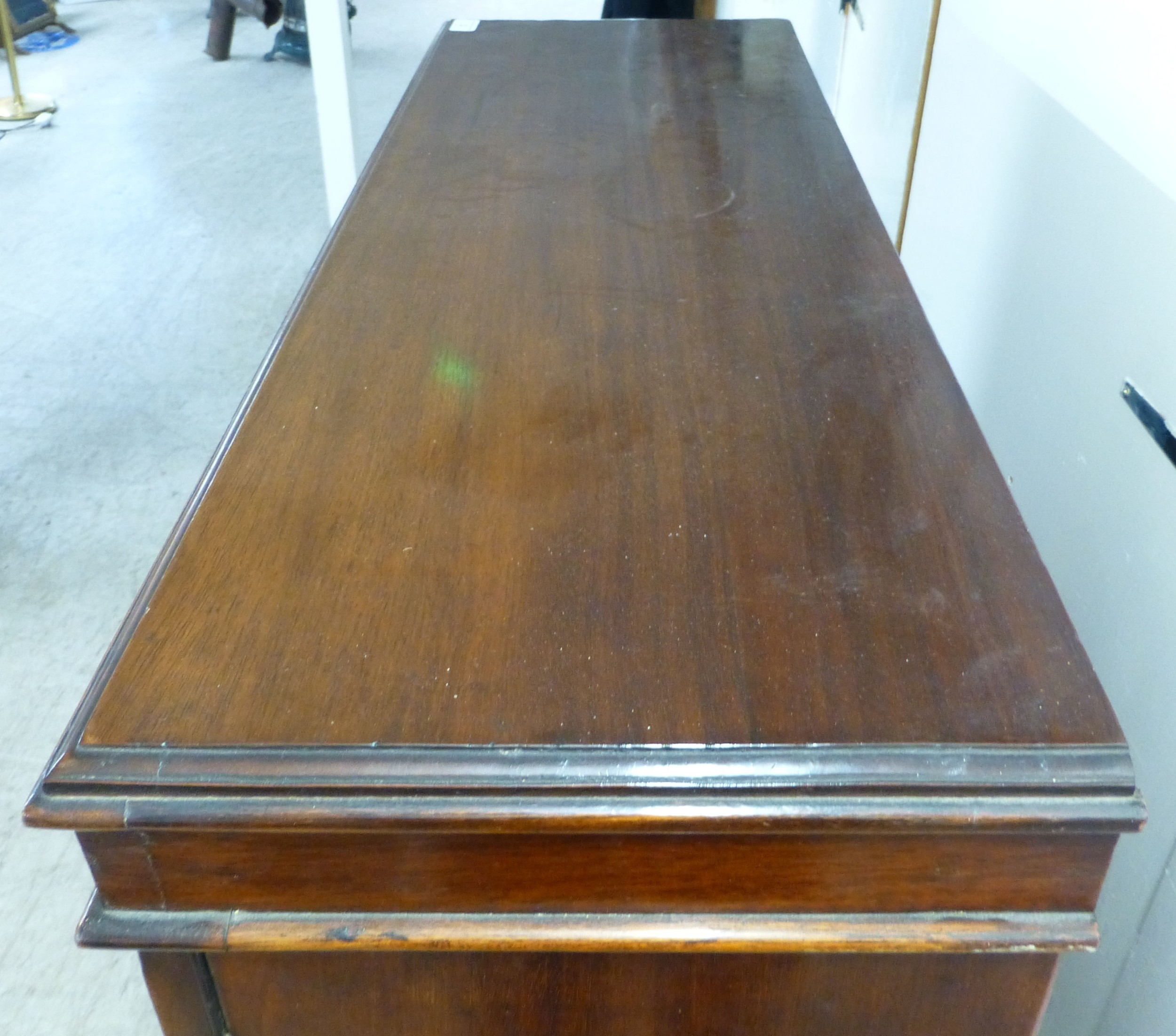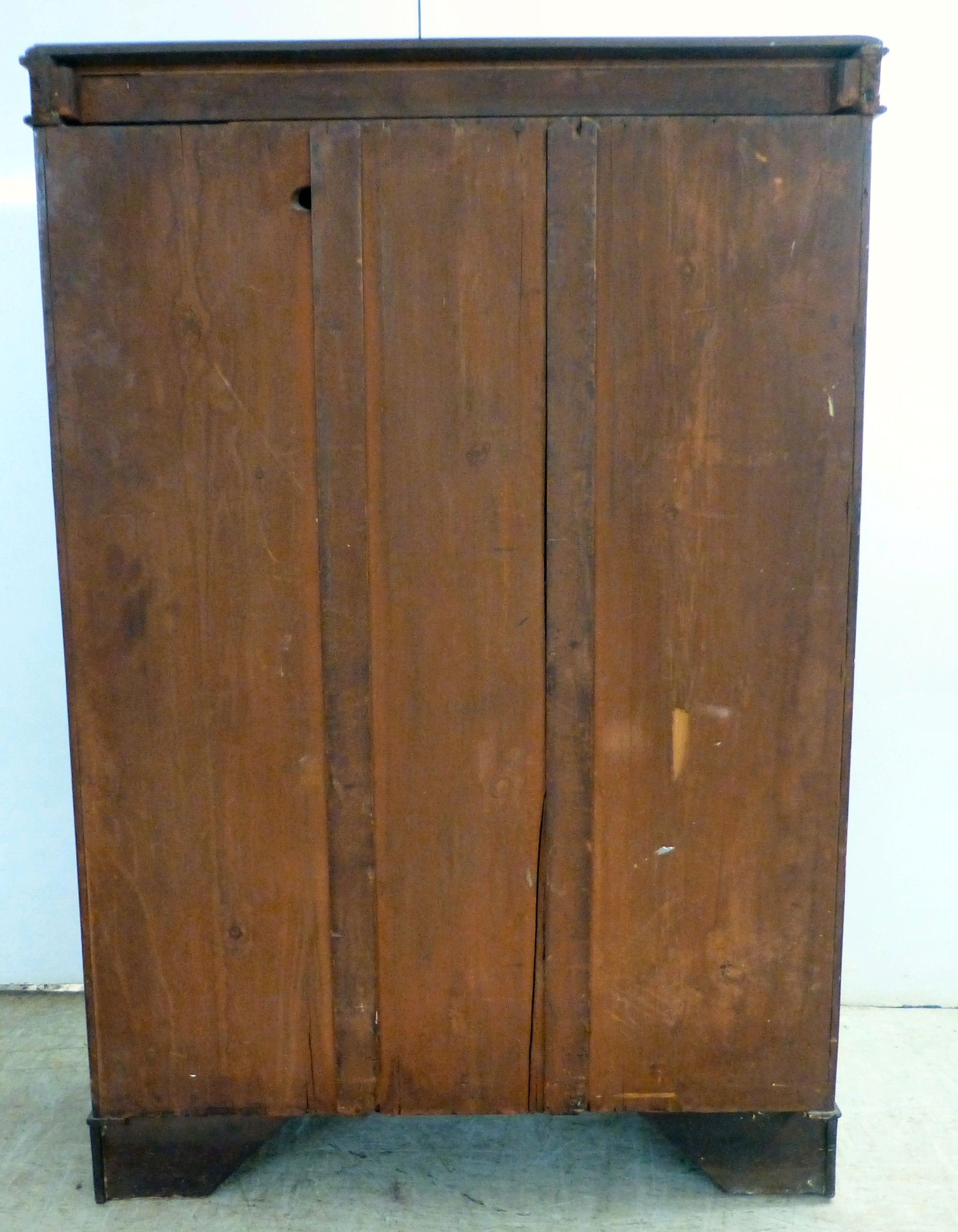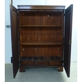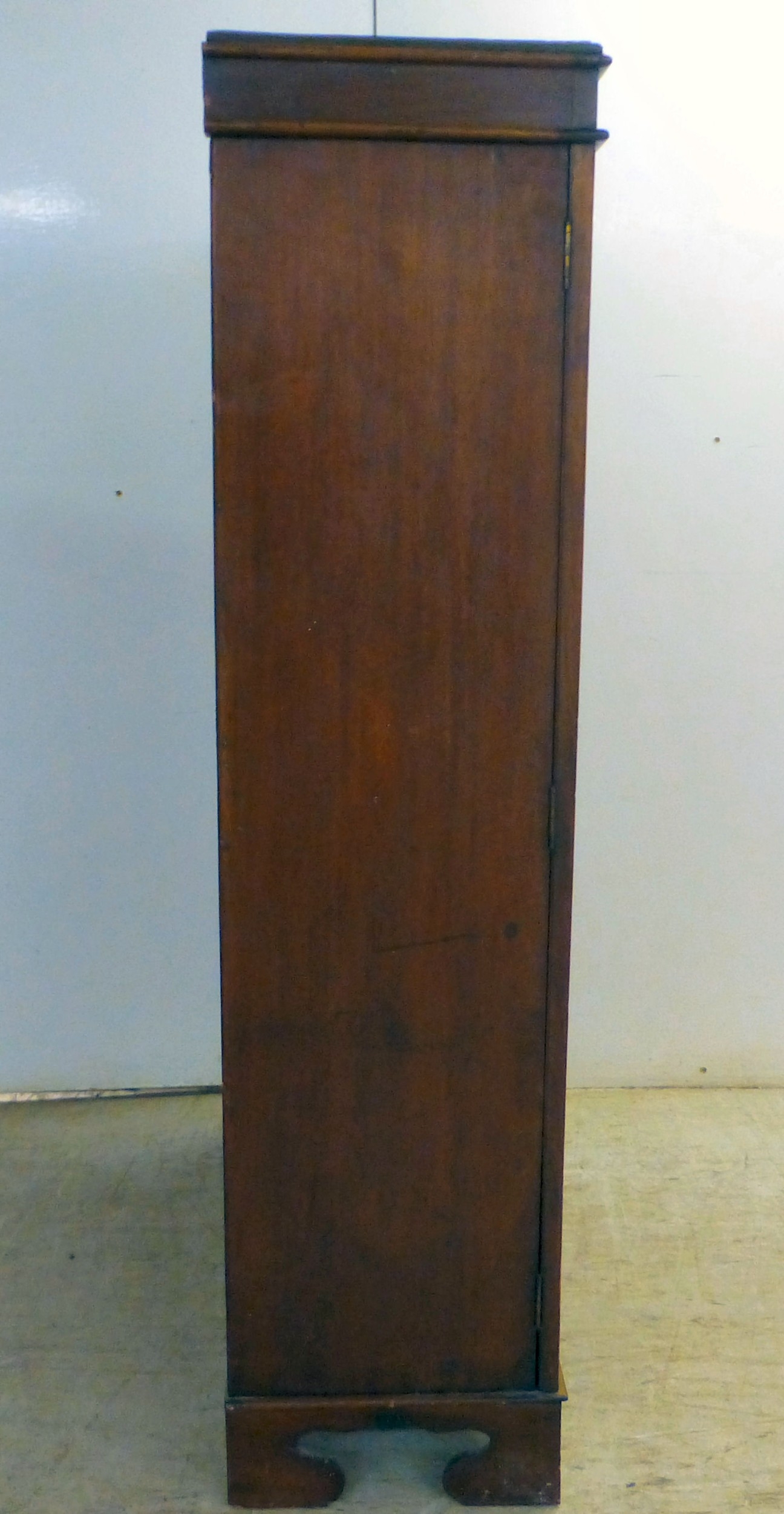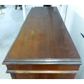 An early 20thC mahogany two door cabinet, enclosing two shelves, over three in-line drawers, raised on bracket feet 49"h 35"w