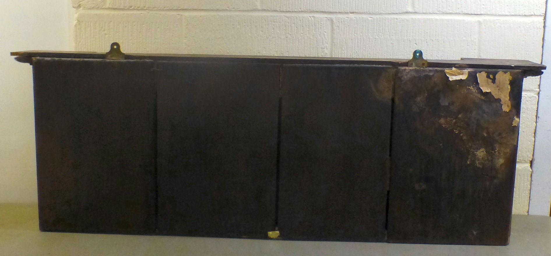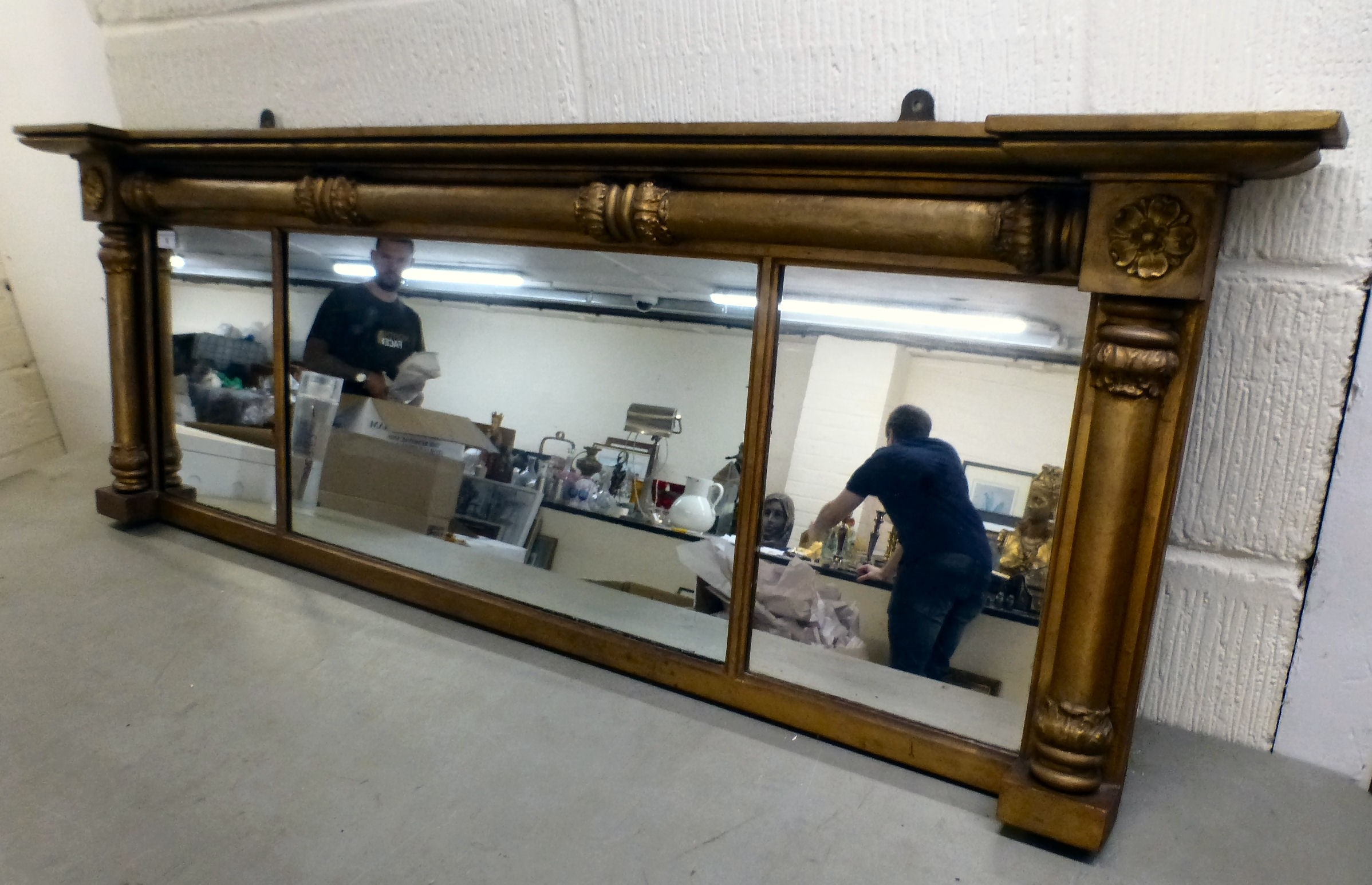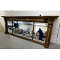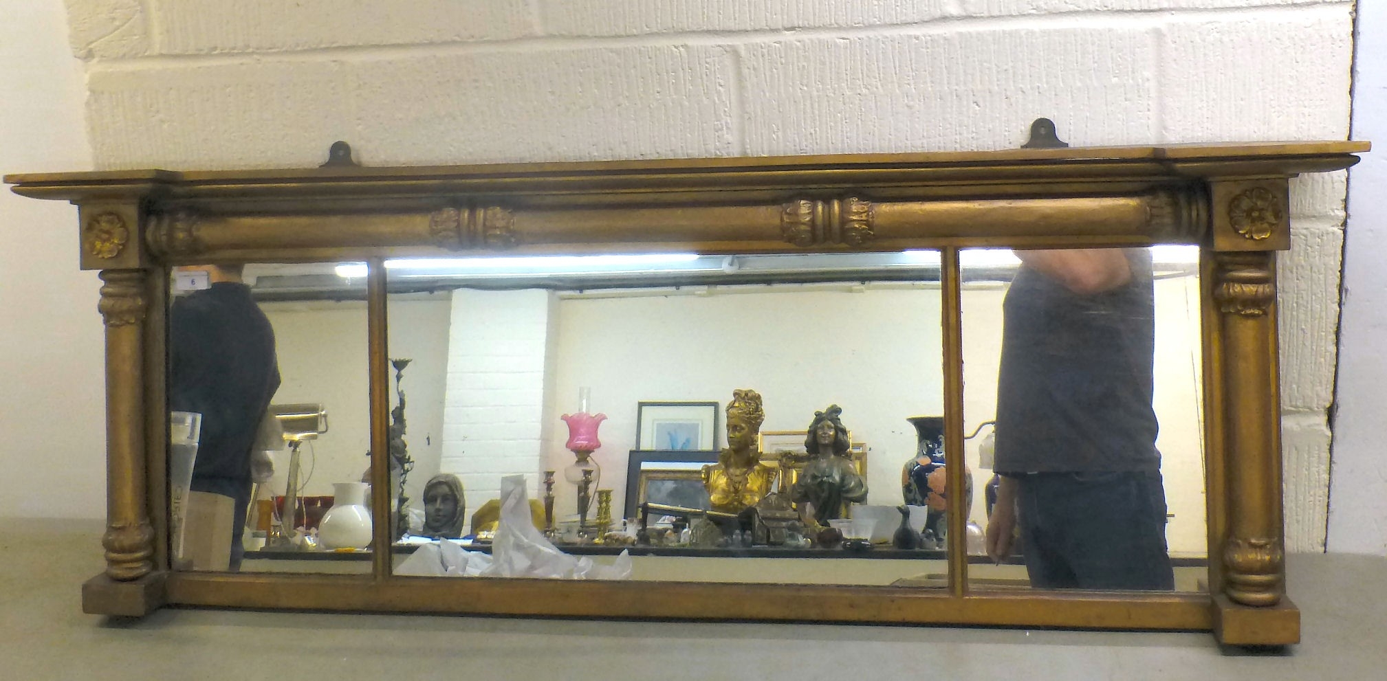 A late 19thC gilt painted, inverted breakfront mirror, the three section plate set between pillar ornament, on a plinth 20"h 56"w